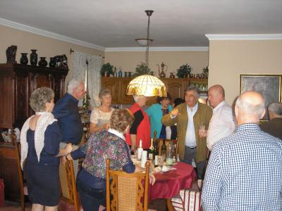 Az ajándékok, apró figyelmességek átadása után - egy nagy kerámia-órát is vittünk magunkkal - jelezve, hogy az idő nem múló, hanem álló?! - barátságunkat tekintve. A pazarul elkészített hidegtálak gyorsan asztalhoz ültették a már éhes vendégeket. Sorjáztak a találkozások emlékei, tréfás történései, mindenkinek volt egy-egy sztorija a közös barátkozásból.
